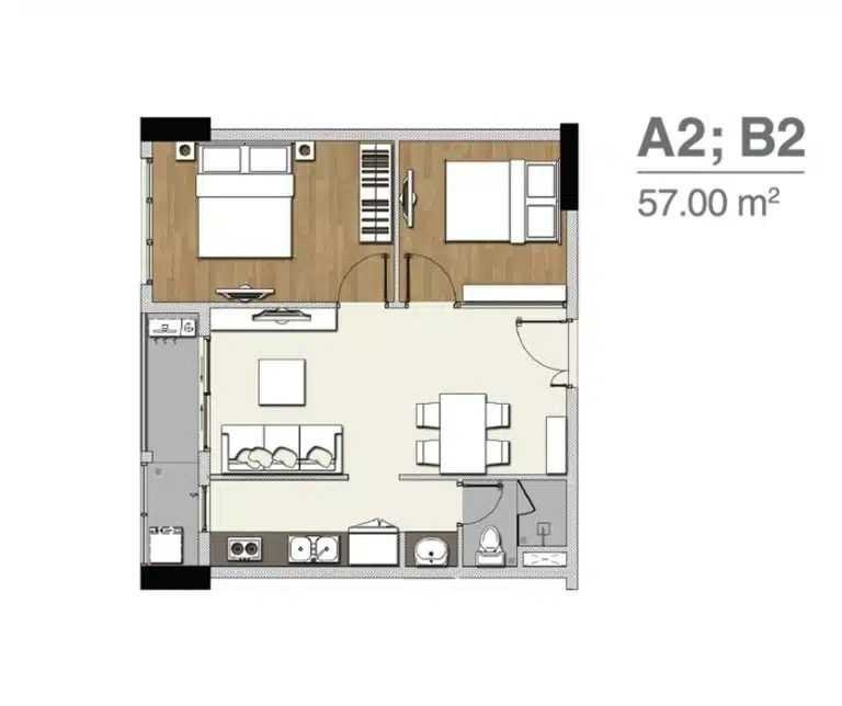 2 phòng ngủ – 2 nhà vệ sinh – 57m2