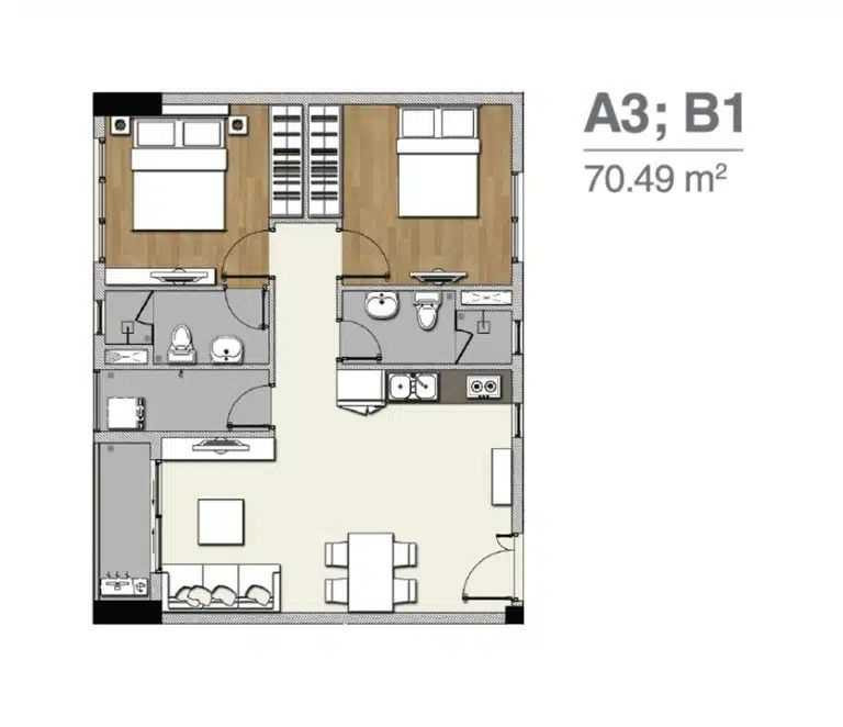 2 phòng ngủ – 2 nhà vệ sinh – 70.49m2