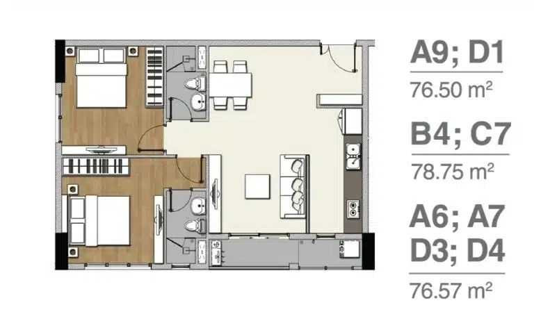 2 phòng ngủ – 2 nhà vệ sinh – 76.50m2 – 76.57m2