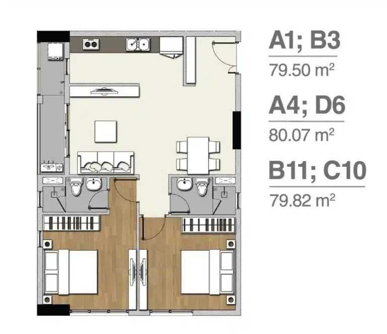 2 phòng ngủ – 2 nhà vệ sinh – 79.50 – 80.07m2