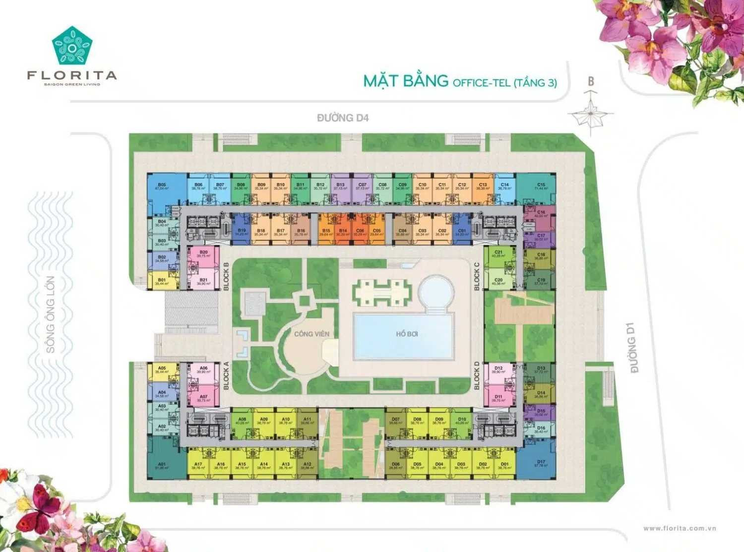 Mặt bằng Officetel tầng 3 Florita Quận 7, với thiết kế mở độc đáo bao quanh khu vực hồ bơi và công viên, các căn hộ Office-Tel tại đây được hưởng trọn tầm nhìn xanh mát và không khí trong lành, tạo nên môi trường làm việc đầy cảm hứng. Sự phân chia các Block rõ ràng (A, B, C, D) cùng với vị trí giáp các tuyến đường huyết mạch Đường D4 và Đường D1 giúp tăng cường khả năng kết nối, khẳng định vị thế là lựa chọn đầu tư thông minh, vừa khai thác kinh doanh vừa tận hưởng tiện ích nội khu đẳng cấp ngay tại trung tâm Quận 7.