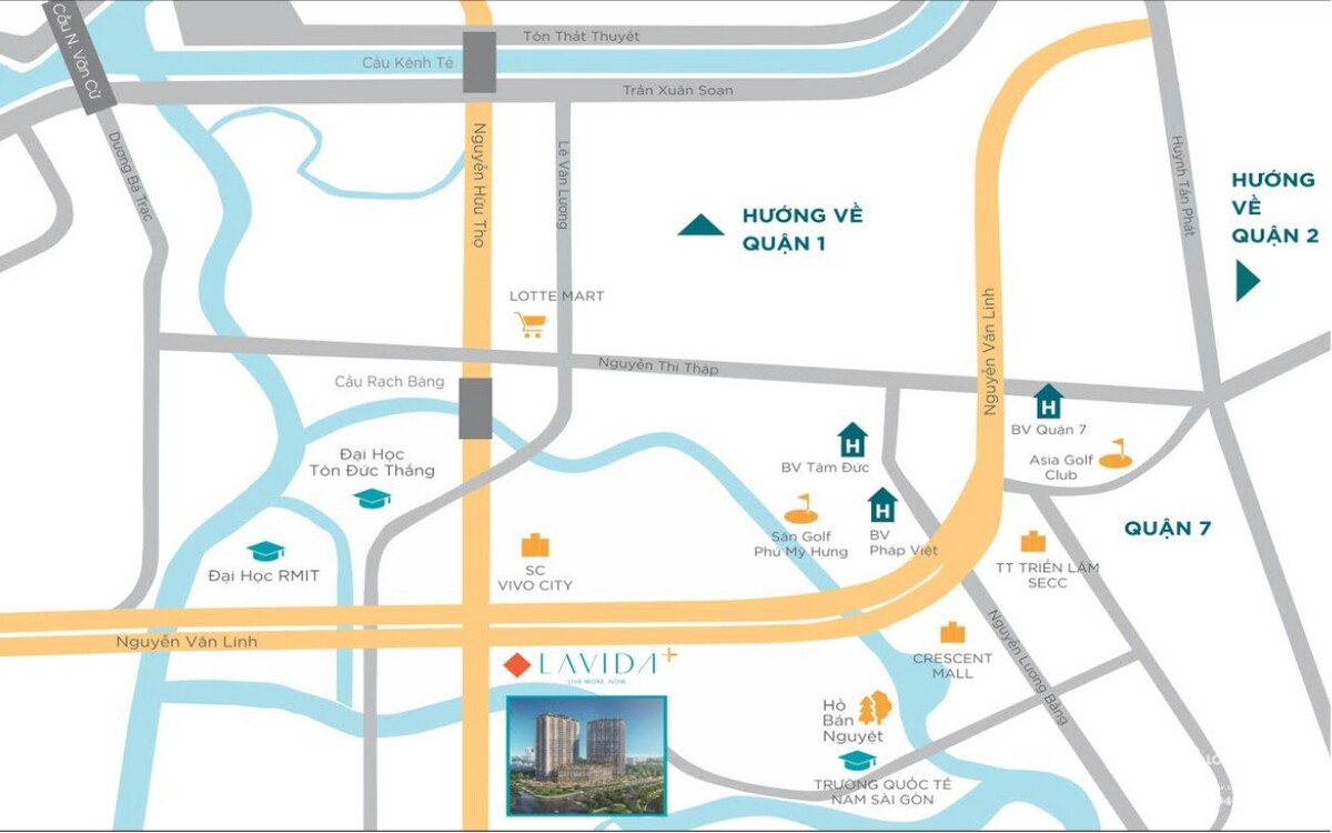 Lavida Plus tọa lạc tại vị trí vàng của khu Nam Sài Gòn, ngay mặt tiền đường Nguyễn Hữu Thọ và Nguyễn Văn Linh, Phường Tân Phong, Quận 7. Đây là khu vực có tốc độ phát triển nhanh chóng, tập trung nhiều tiện ích cao cấp và hạ tầng giao thông hiện đại.