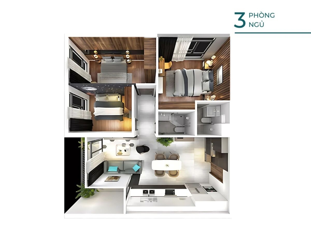 Căn 3 phòng ngủ – 2 nhà vệ sinh, 95m2