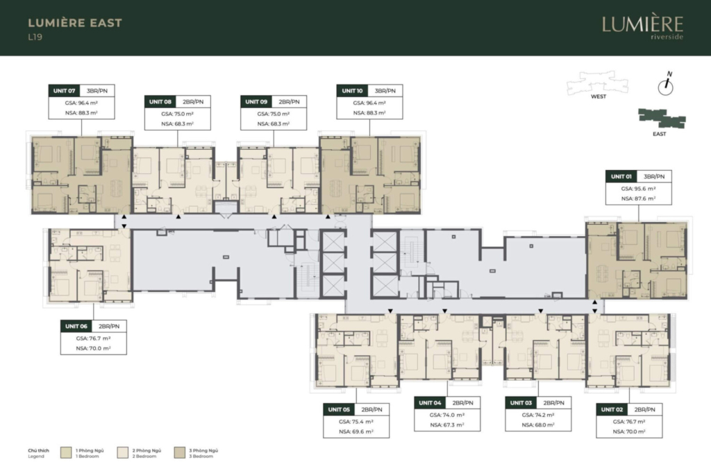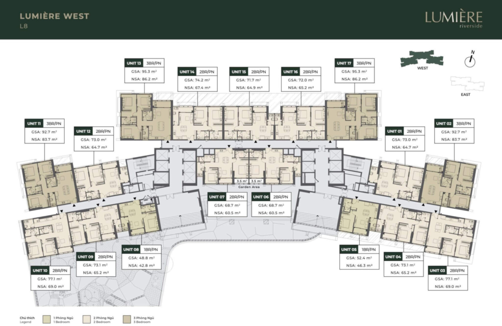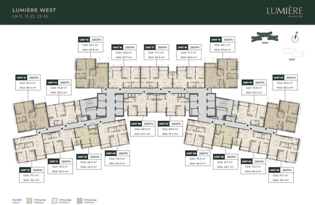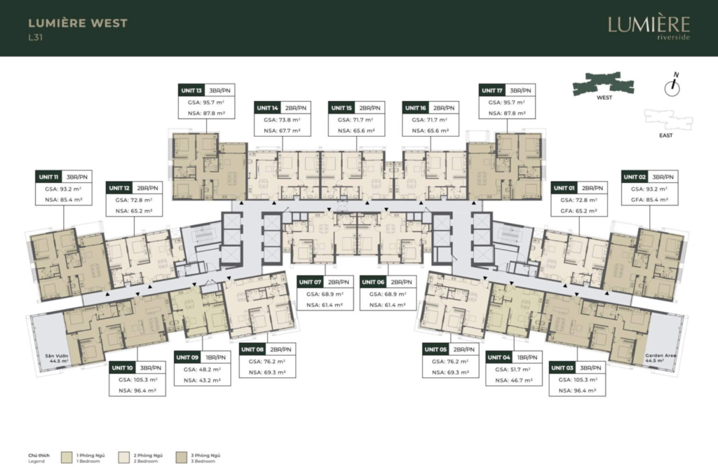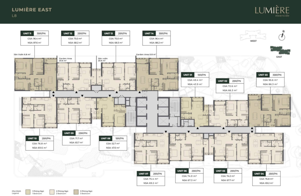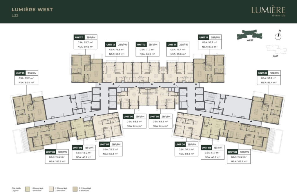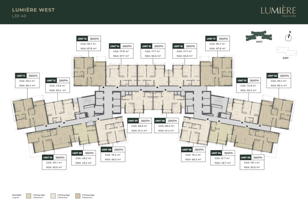 Mặt bằng Lumiere Riverside được chủ đầu tư thiết kế chi tiết và minh bạch, giúp khách hàng dễ dàng theo dõi từng thông số cụ thể của mỗi căn hộ. Dự án bao gồm tổng cộng 1.030 căn hộ, chia thành hai tòa tháp: Lumiere East cao 36 tầng và Lumiere West cao 44 tầng.
