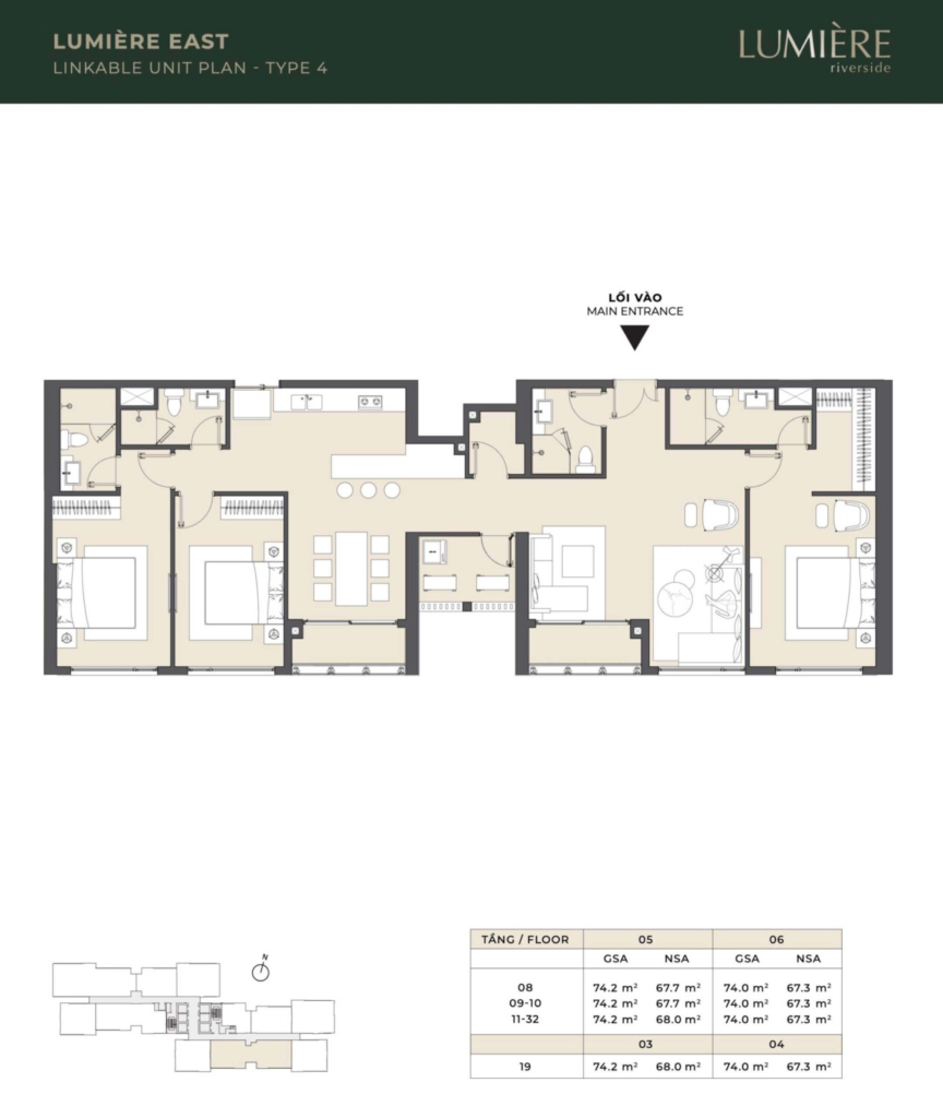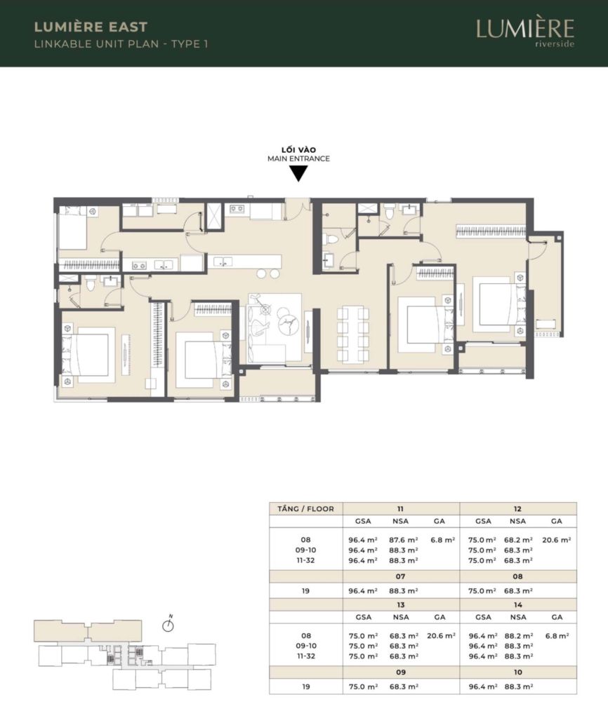 Mặt bằng căn hộ ghép 3-4 phòng ngủ Lumiere Riverside – Tháp East
