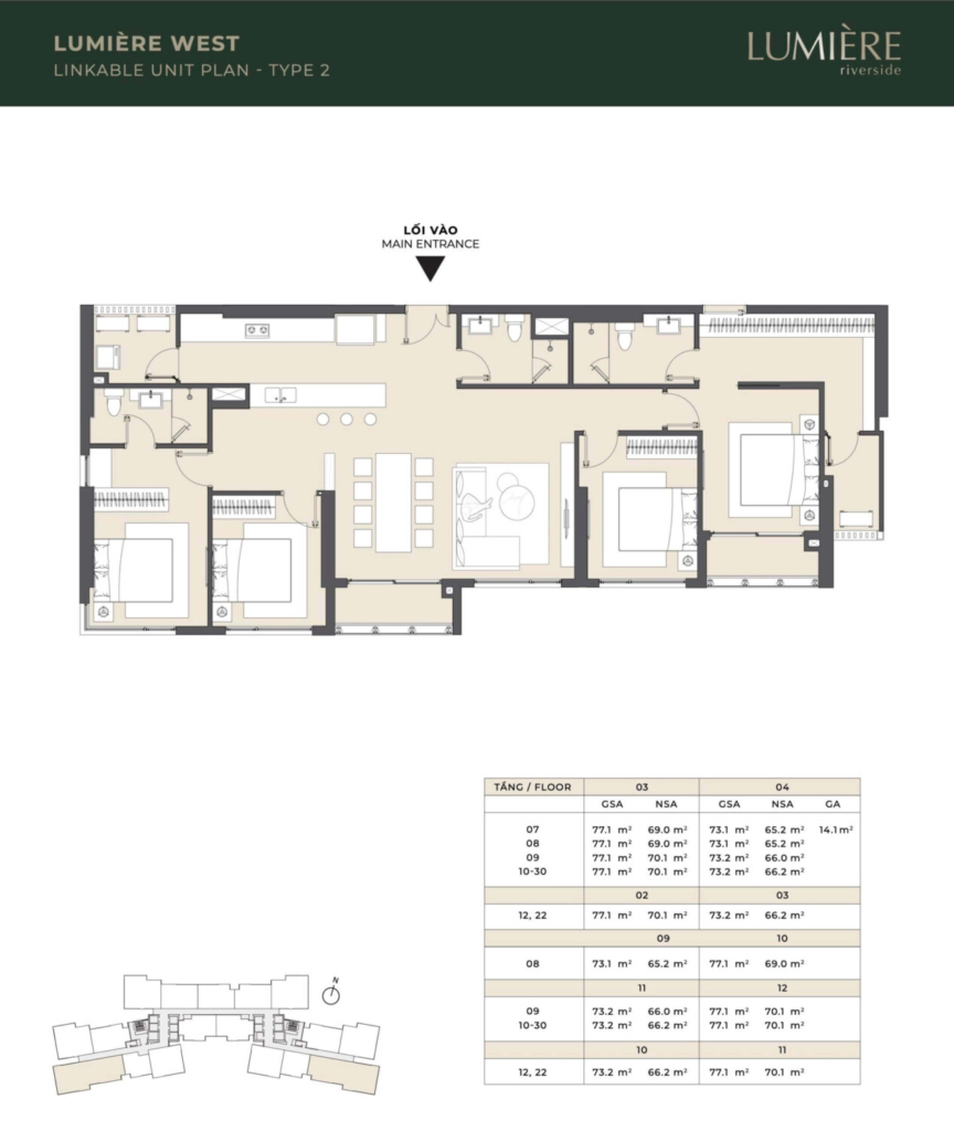 Căn hộ 4 Phòng ngủ tháp West – Type 2, 73 – 77m2