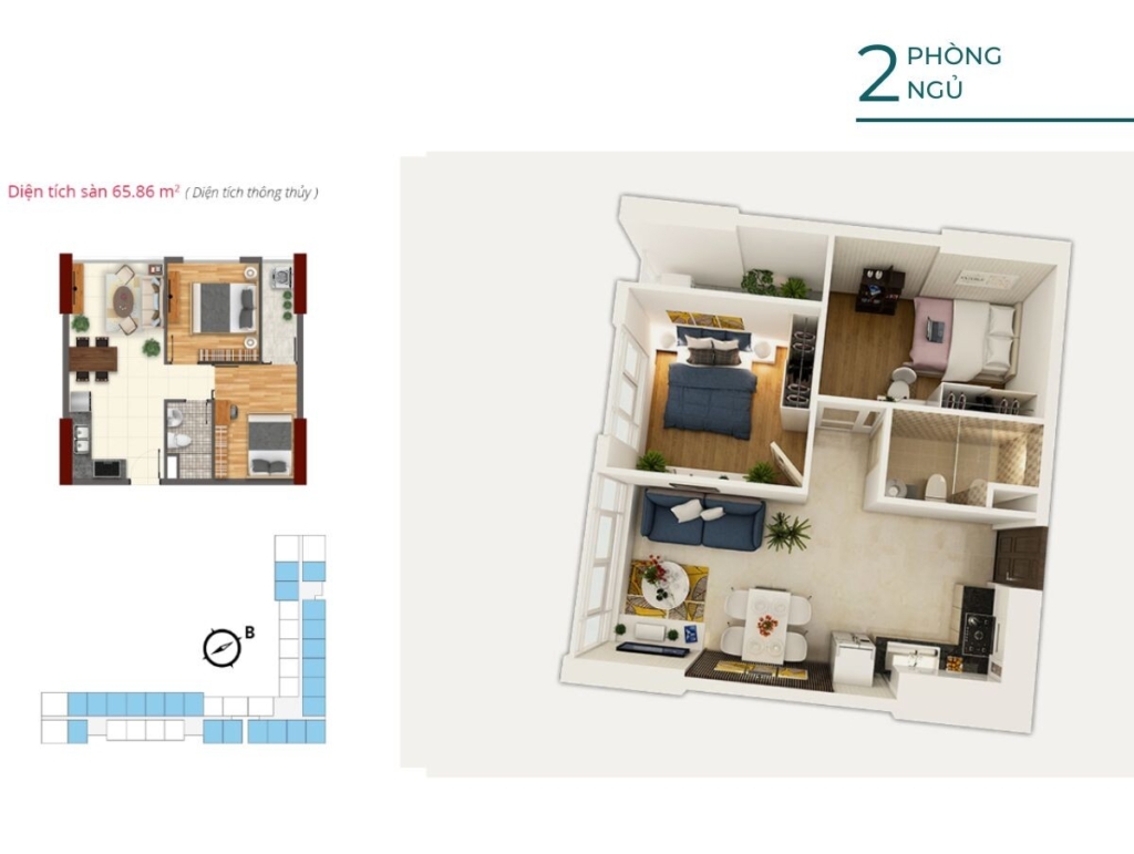 2 phòng ngủ – 1 nhà vệ sinh, 54 – 66m2