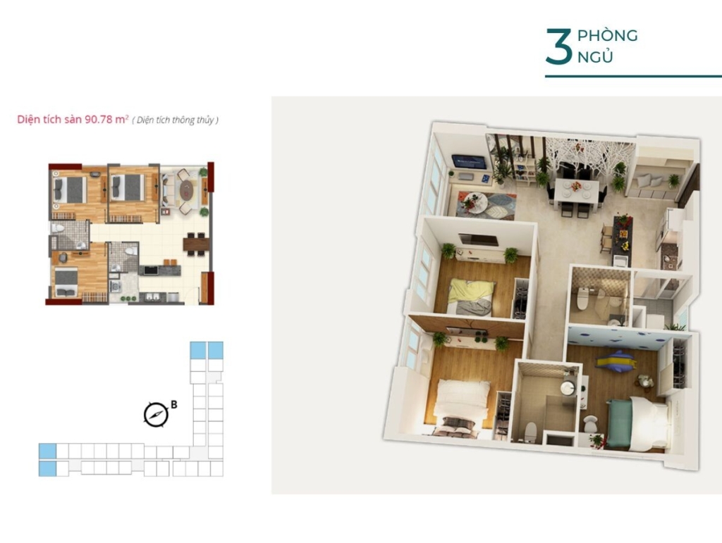 3 phòng ngủ – 2 nhà vệ sinh, 91m2