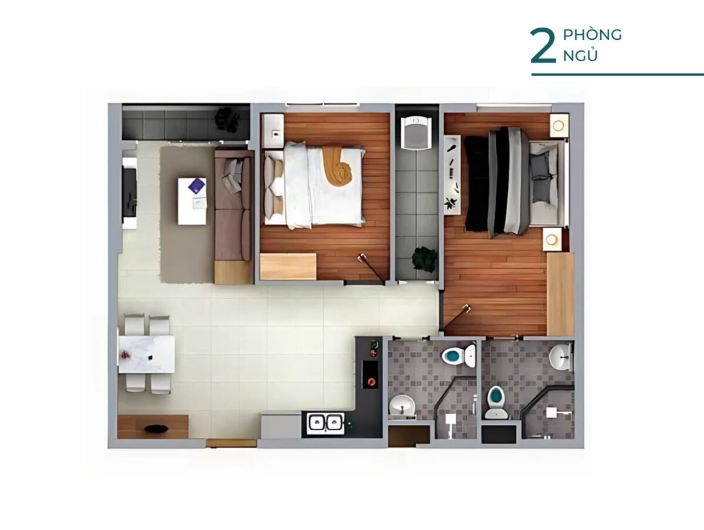 Căn 2 phòng ngủ – 2 nhà vệ sinh, 68 – 69m2