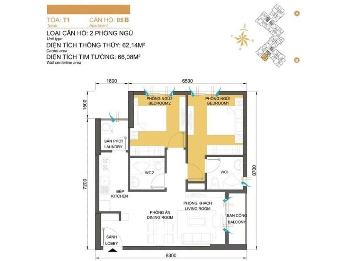 – Diện tích 58m², thiết kế 2 phòng ngủ – 2 nhà vệ sinh, bố trí gọn gàng, tối ưu không gian sử dụng