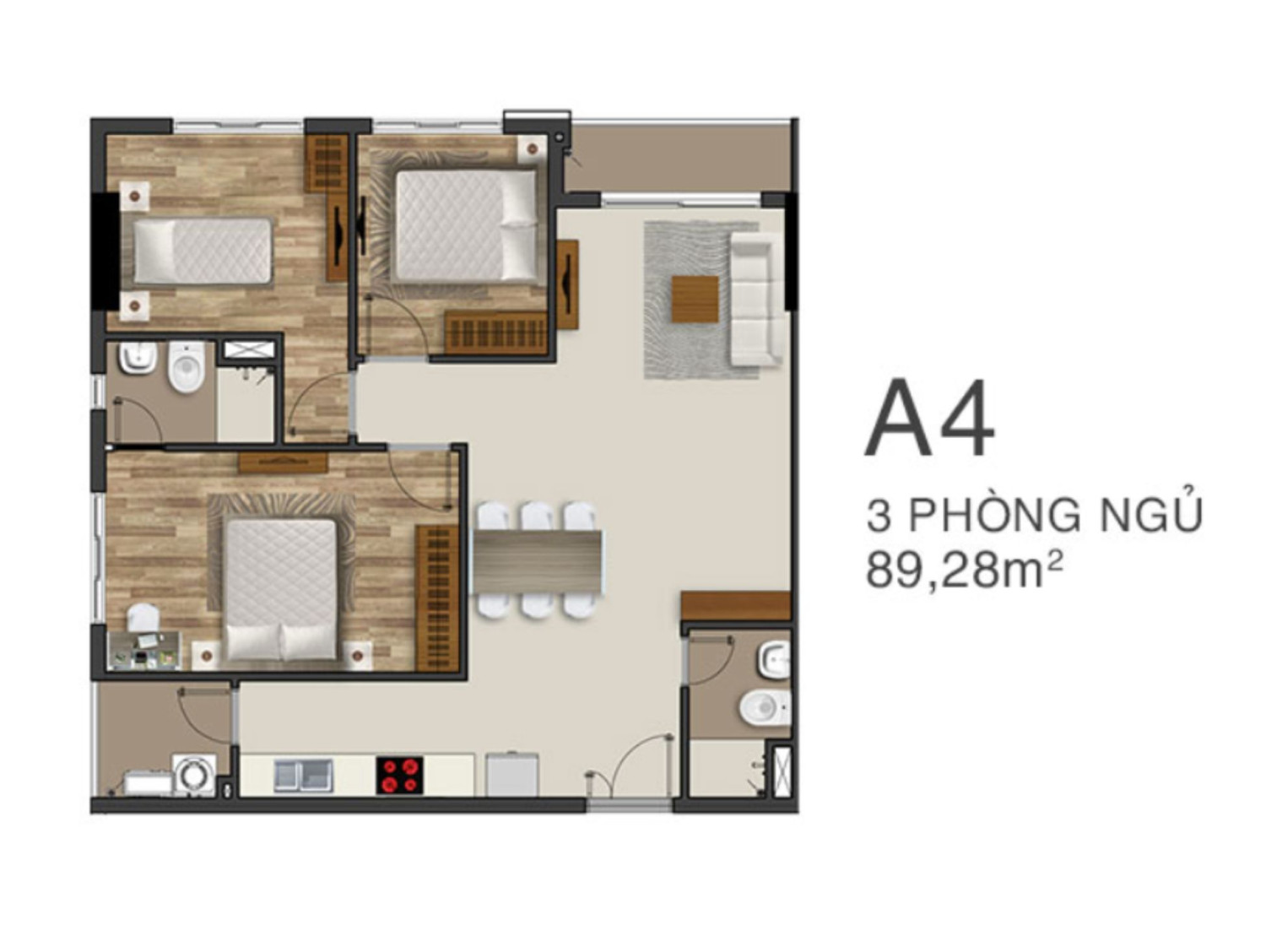Diện tích 89m², thiết kế 3 phòng ngủ – 2 nhà vệ sinh, không gian rộng rãi cho gia đình nhiều thành viên