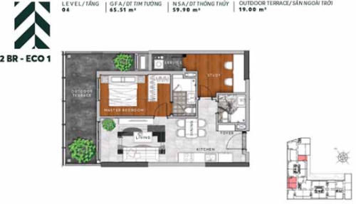 Căn hộ Urban Green cho thuê có diện tích 66m², thiết kế khoa học với 2 phòng ngủ và 2 nhà vệ sinh.