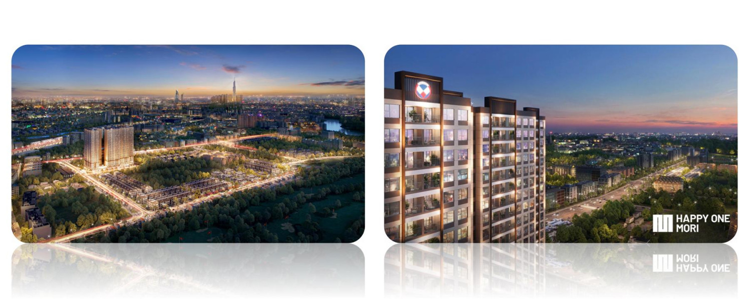 Bên cạnh đó, toàn bộ khu căn hộ được áp dụng hệ thống chiếu sáng mặt dựng và cảnh quan kiến trúc theo tầng độc đáo. Vào ban đêm, ánh sáng nghệ thuật được lập trình tinh tế, tôn vinh đường nét kiến trúc hiện đại của tòa tháp 33 tầng. Hiệu ứng ánh sáng thay đổi theo thời gian, tạo nên vẻ đẹp lung linh, sang trọng và đầy cảm hứng, biến Happy One Mori thành điểm nhấn nổi bật giữa trung tâm Dĩ An – Bình Dương.