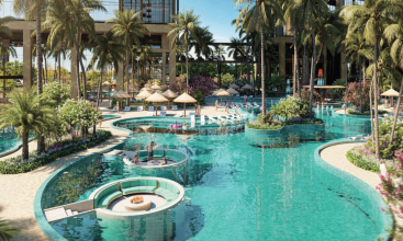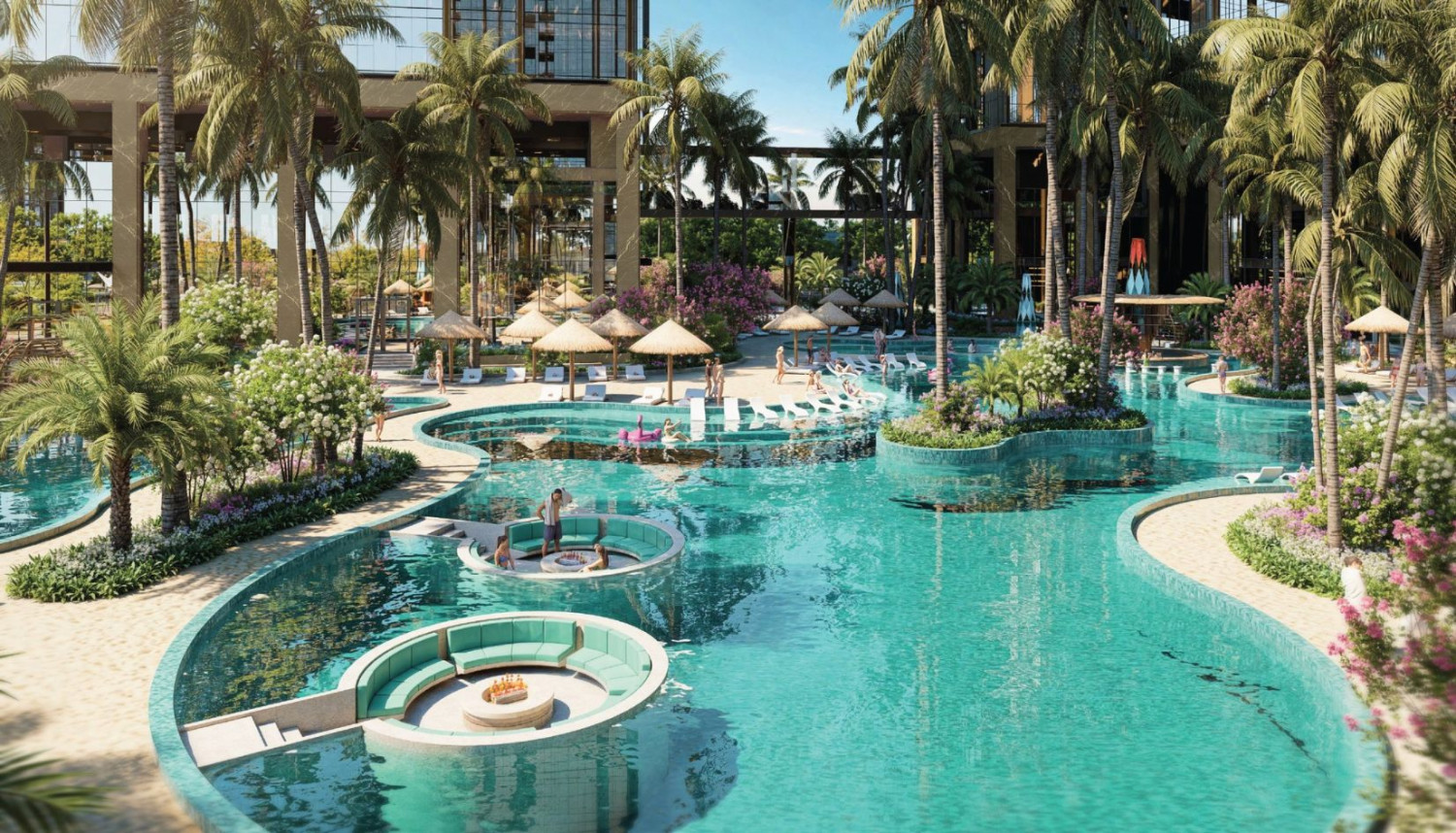 Khu hồ bơi tràn bờ 400m², kết hợp thác nước, sông lười và jacuzzi thư giãn.
