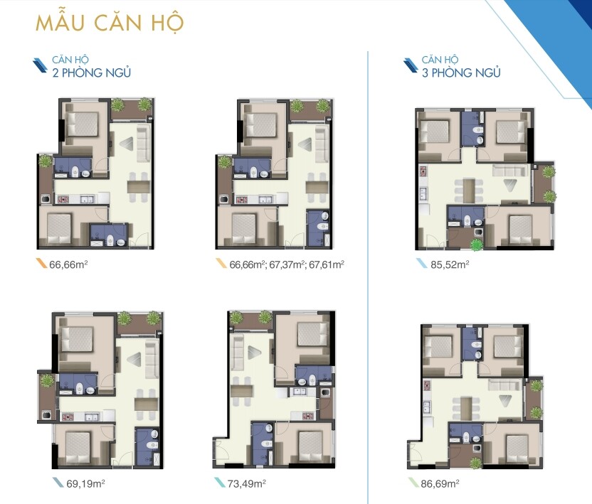 Chung cư Saigon Riverside Quận 7 được thiết kế với 5 block: Block Mars (Sao Hỏa), Block Saturn (Sao Thổ), Block Venus (Sao Kim), Block Mercury (Sao Thủy), và Block Uranus (Sao Thiên Vương). Các căn hộ có diện tích từ 53,2m2 đến 86,69m2, với 1-3 phòng ngủ. Tất cả các căn hộ đều được thiết kế tối ưu với không gian mở và tầm nhìn xa, cho phép cư dân ngắm nhìn toàn cảnh thành phố từ nhiều phương diện.