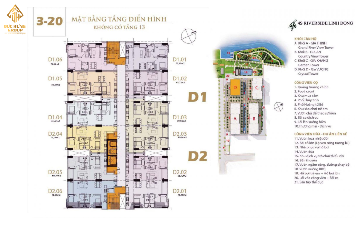 Dự án chung cư 4S Riverside Linh Đông Thủ Đức mang đến sự đa dạng về diện tích với tất cả các căn hộ đều có ban công và sân phơi riêng, giúp tối đa hóa ánh sáng và lưu thông không khí. Với 4 tòa chung cư độc đáo, bao gồm 3 tòa A, B, C cao 15 tầng và tòa D cao 21 tầng, mỗi tòa được thiết kế với những đặc trưng riêng biệt.