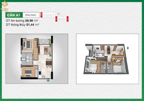 – Căn hộ A1: 2PN – 2WC, có diện tích thông thủy: 51.44m2 và diện tích tim tường: 58.90m2