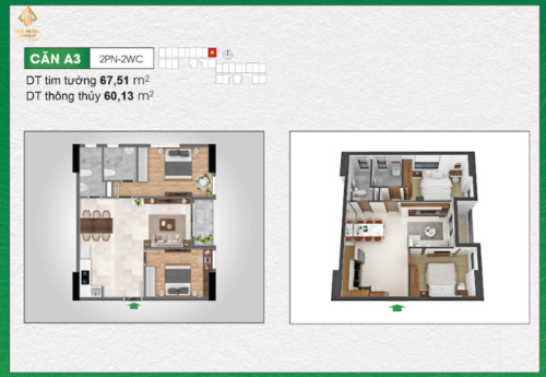 – Căn hộ A3: 2PN – 2WC, có diện tích thông thủy: 60.13m2 và diện tích tim tường: 67.51m2