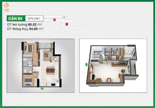 – Căn hộ B3: 2PN – 2WC, có diện tích thông thủy: 54.65m2 và diện tích tim tường: 60.02m2