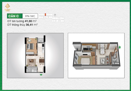 – Căn hộ C: 1PN – 1WC, có diện tích thông thủy: 51.44m2 và diện tích tim tường: 58.90m2