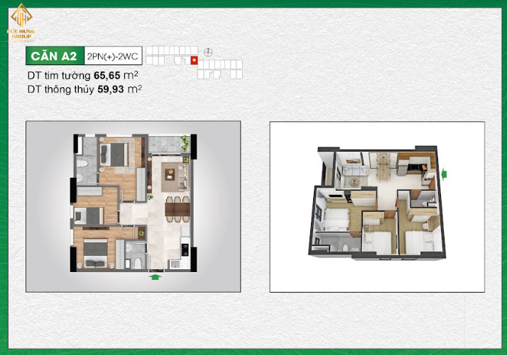 – Căn hộ A2: 2PN (+) – 2WC, có diện tích thông thủy: 59.93m2 và diện tích tim tường: 65.65m2