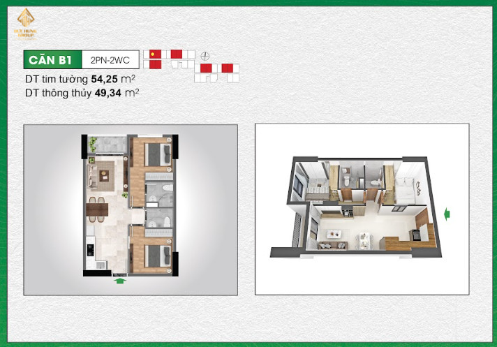 – Căn hộ B1: 2PN – 2WC, có diện tích thông thủy: 49.34m2 và diện tích tim tường: 54.25m2