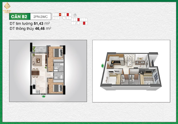– Căn hộ B2: 2PN – 2WC, có diện tích thông thủy: 46.46m2 và diện tích tim tường: 51.43m2