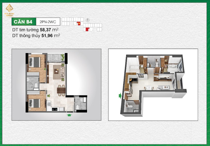– Căn hộ B4: 2PN – 2WC, có diện tích thông thủy: 51.96m2 và diện tích tim tường: 58.37m2