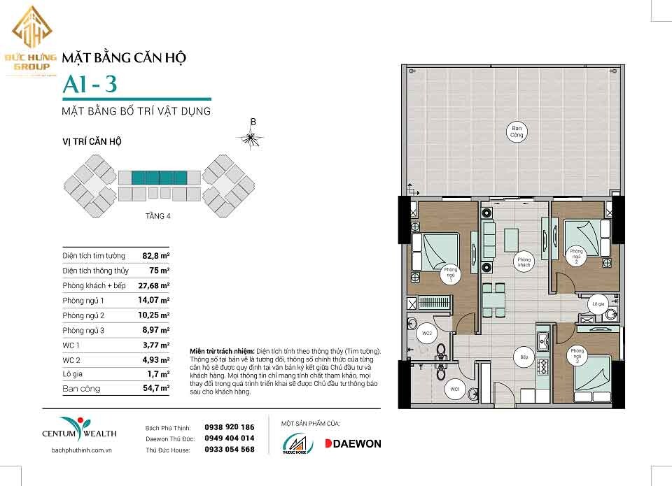 – Căn hộ A1-3: 3PN – 2WC, có diện tích thông thủy: 75m2 và diện tích tim tường: 82.8m2