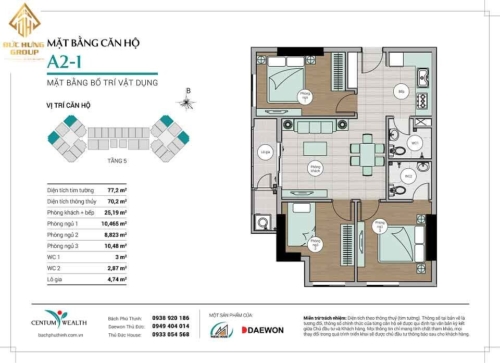 – Căn hộ A2-1: 3PN – 2WC, có diện tích thông thủy: 70.2m2 và diện tích tim tường: 77.2m2