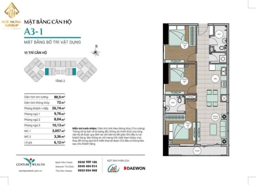 – Căn hộ A3-1: 3PN – 2WC, có diện tích thông thủy: 72m2 và diện tích tim tường: 80.5m2