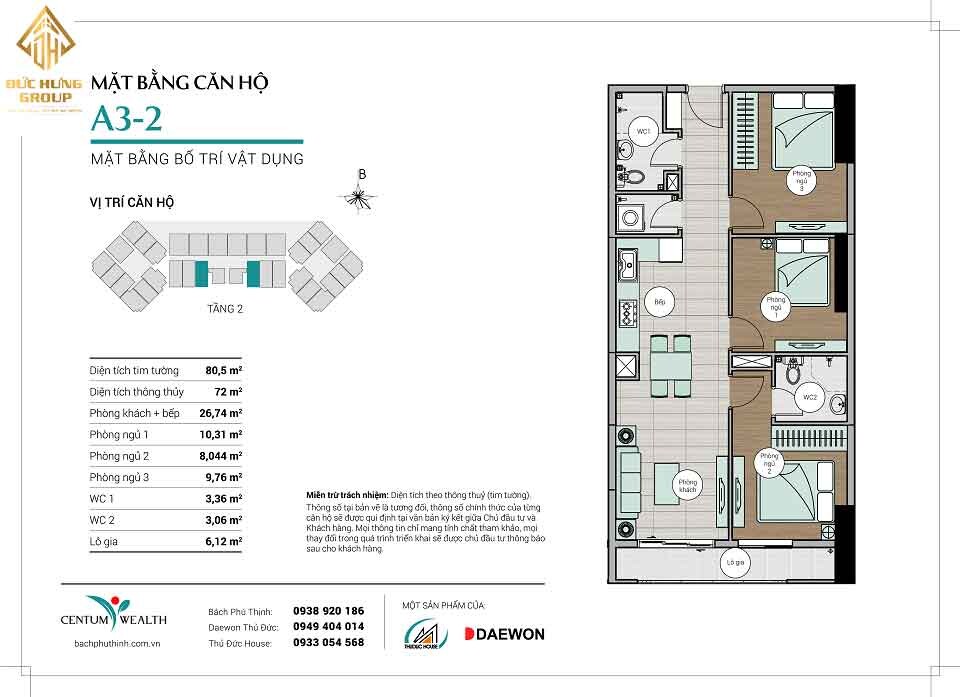 – Căn hộ A3-2: 3PN – 2WC, có diện tích thông thủy: 72m2 và diện tích tim tường: 80.5m2