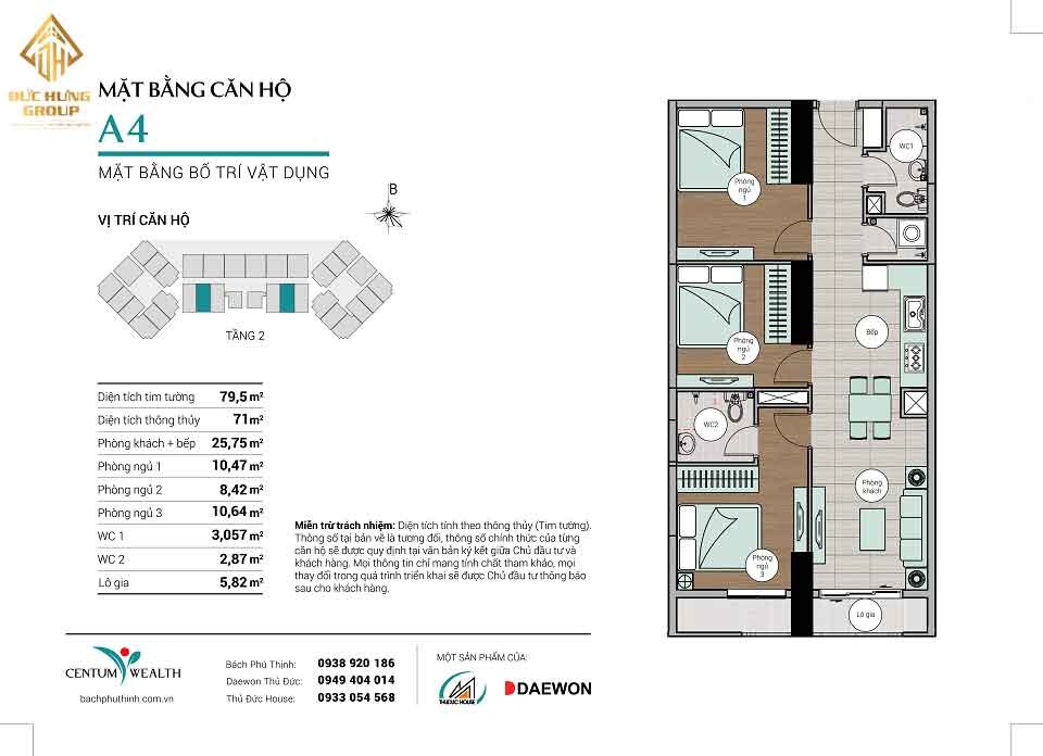 – Căn hộ A4: 3PN – 2WC, có diện tích thông thủy: 71m2 và diện tích tim tường: 79.5m2