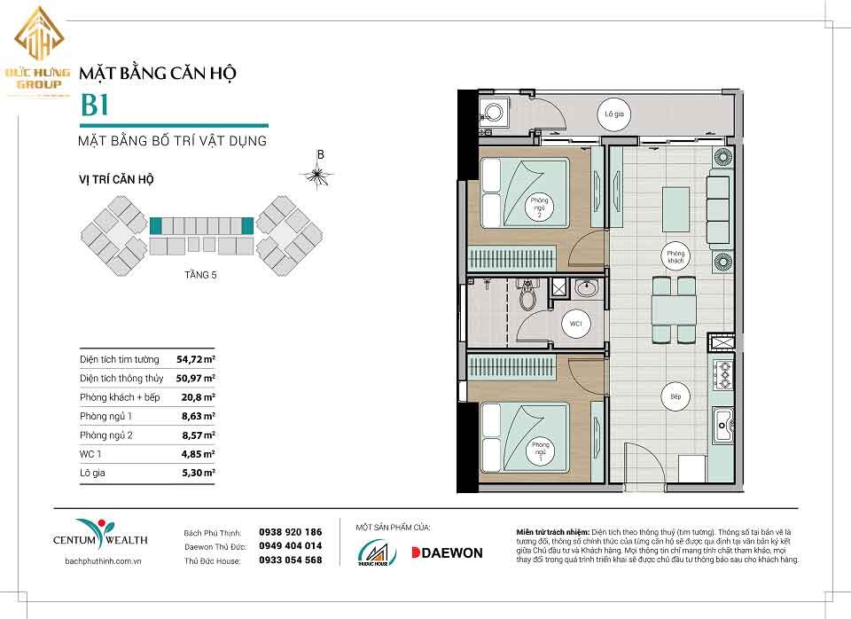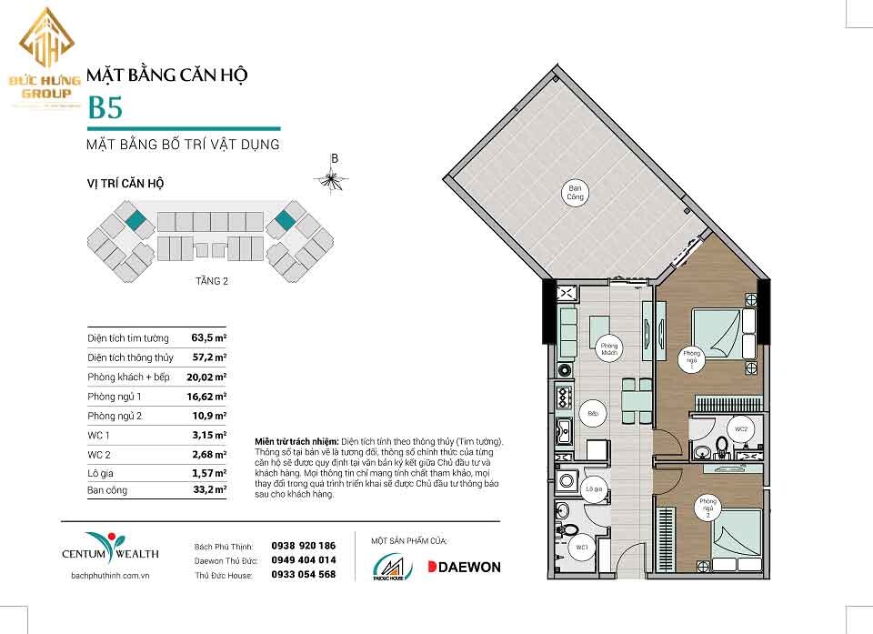 – Căn hộ B5: 2PN – 2WC, có diện tích thông thủy: 57.2m2 và diện tích tim tường: 63.5m2