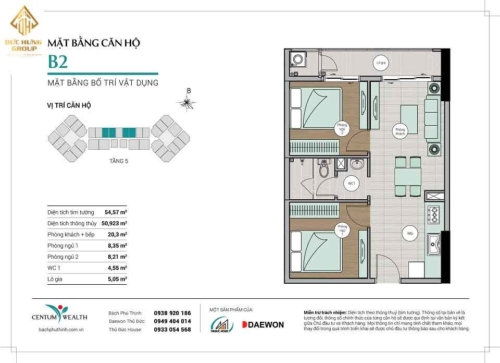 – Căn hộ B2: 2PN – 1WC, có diện tích thông thủy: 50.923 m2 và diện tích tim tường: 54.57m2