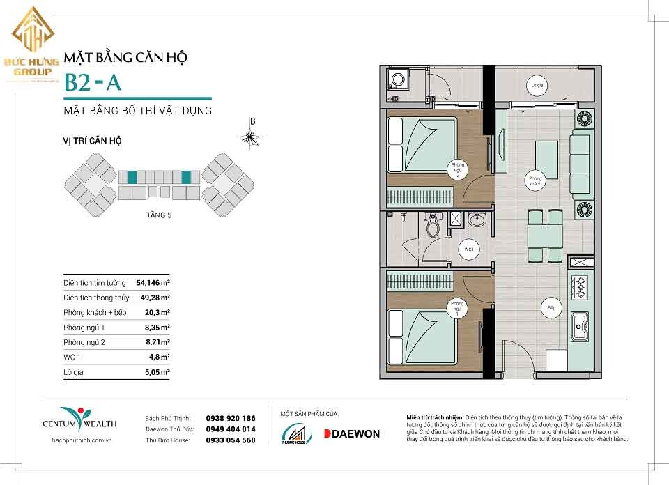 – Căn hộ B2-A: 2PN – 1WC, có diện tích thông thủy: 49.28 m2 và diện tích tim tường: 54.146m2
