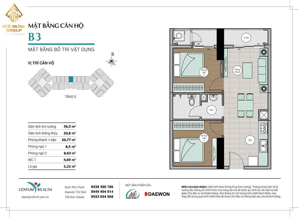 – Căn hộ B3: 2PN – 1WC, có diện tích thông thủy: 50.8 m2 và diện tích tim tường: 56.52