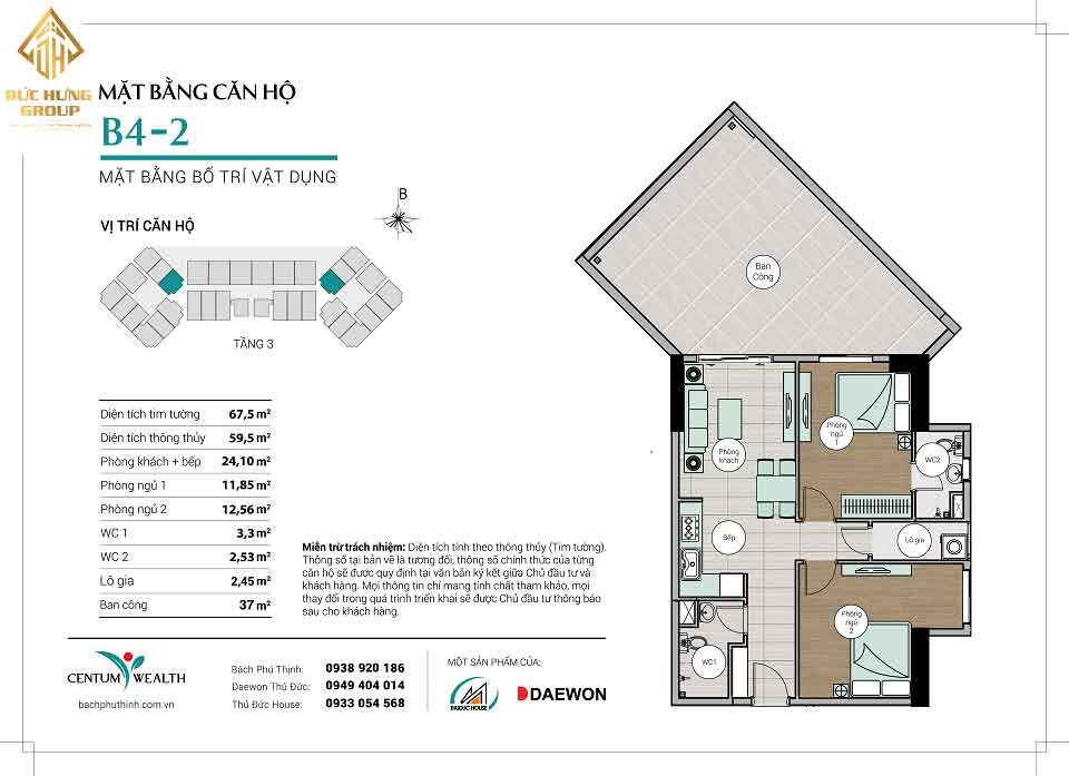 – Căn hộ B4-2: 2PN – 2WC, có diện tích thông thủy: 59.5 m2 và diện tích tim tường: 67.5m2