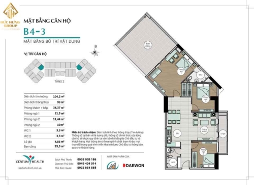 – Căn hộ B4-3: 3PN – 2WC, có diện tích thông thủy: 93m2 và diện tích tim tường: 104.2m2