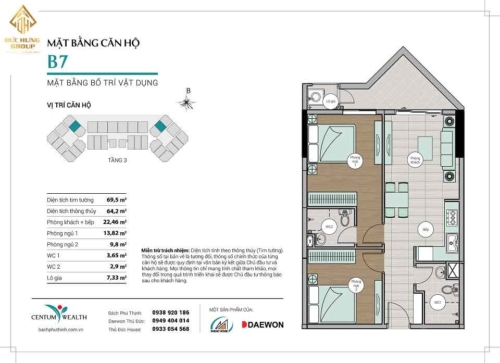 – Căn hộ B7: 2PN – 2WC, có diện tích thông thủy: 64.2m2 và diện tích tim tường: 69.5m2