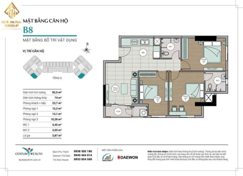 – Căn hộ B8: 2PN – 2WC, có diện tích thông thủy: 74m2 và diện tích tim tường: 82.5m2