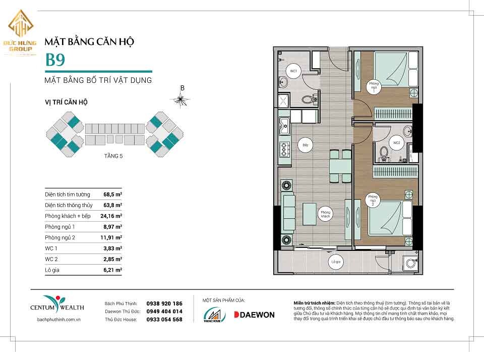 – Căn hộ B9: 2PN – 2WC, có diện tích thông thủy: 63.8m2 và diện tích tim tường: 68.5m2