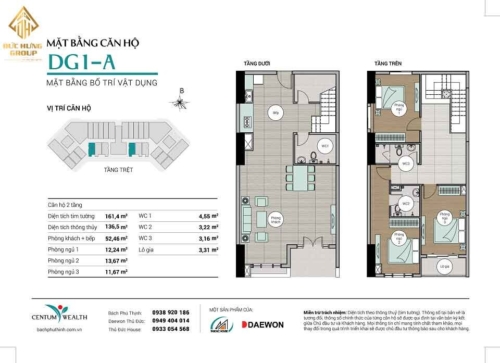 – Căn hộ DG1-A: 3PN – 3WC, có diện tích thông thủy: 136.5m2 và diện tích tim tường: 161.4m2