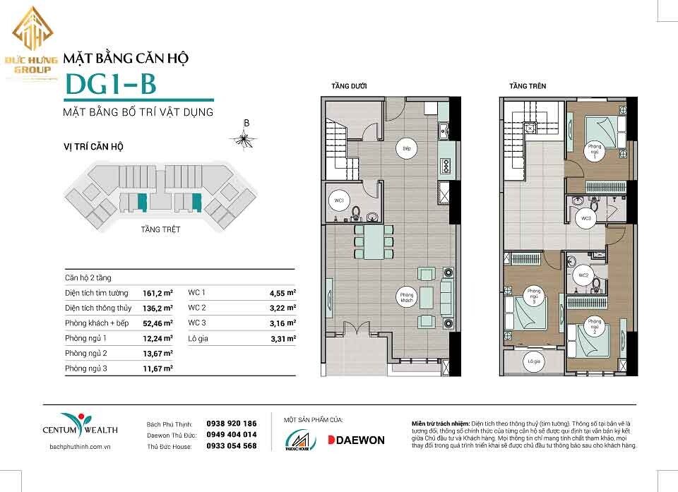 – Căn hộ DG1-B: 3PN – 3WC, có diện tích thông thủy: 136.2m2 và diện tích tim tường: 161.2m2