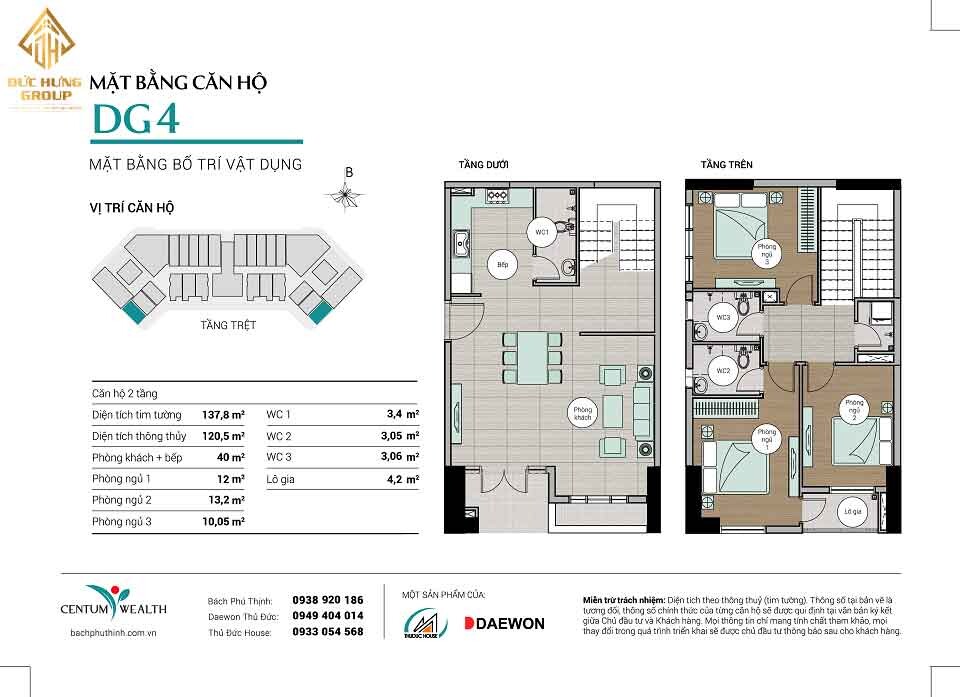 – Căn hộ DG4: 3PN – 3WC, có diện tích thông thủy: 120.5m2 và diện tích tim tường: 137.8m2
