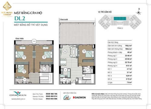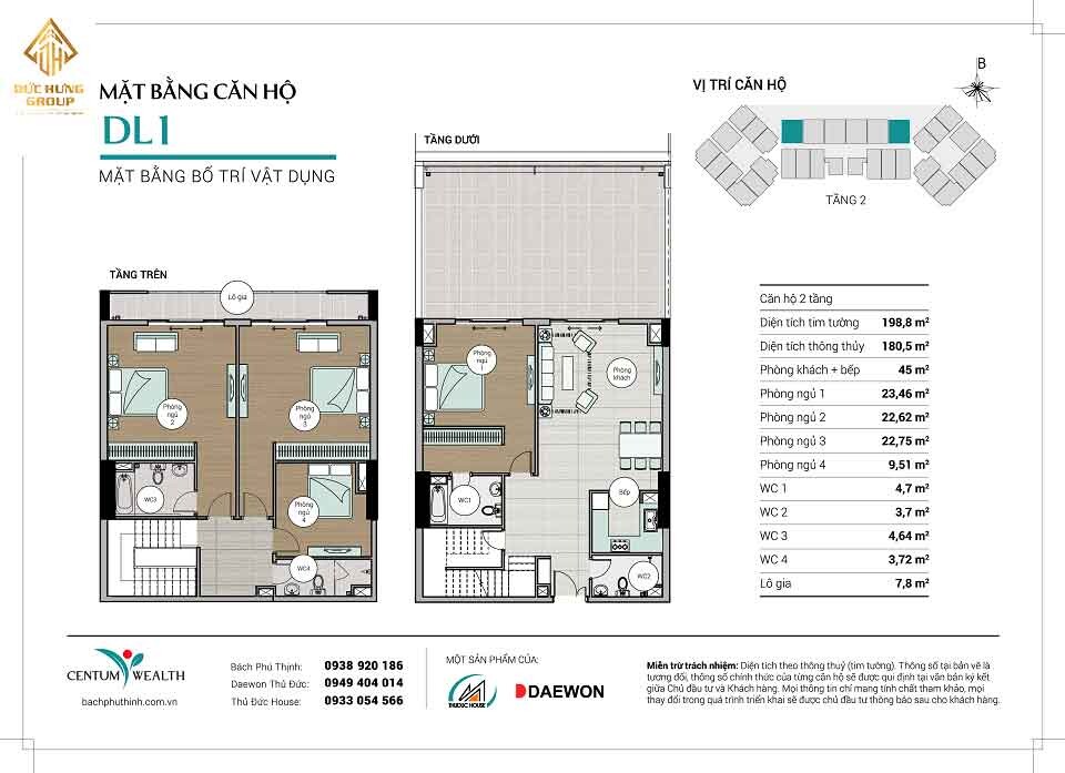 – Căn hộ DL1: 4PN – 4WC, có diện tích thông thủy: 180.5m2 và diện tích tim tường: 198.8m2