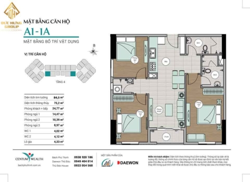 – Căn hộ A1-1A: 3PN – 2WC, có diện tích thông thủy: 75.2 m2 và diện tích tim tường: 84.5m2