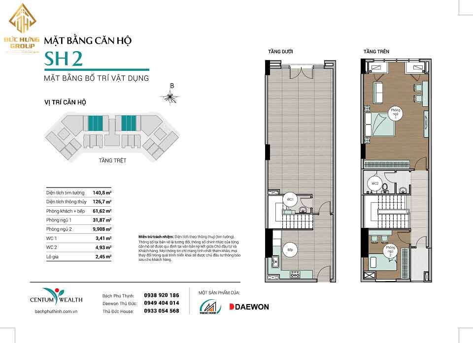 – Căn hộ SH2: 2PN – 2WC, có diện tích thông thủy: 126.7m2 và diện tích tim tường: 140.8m2
