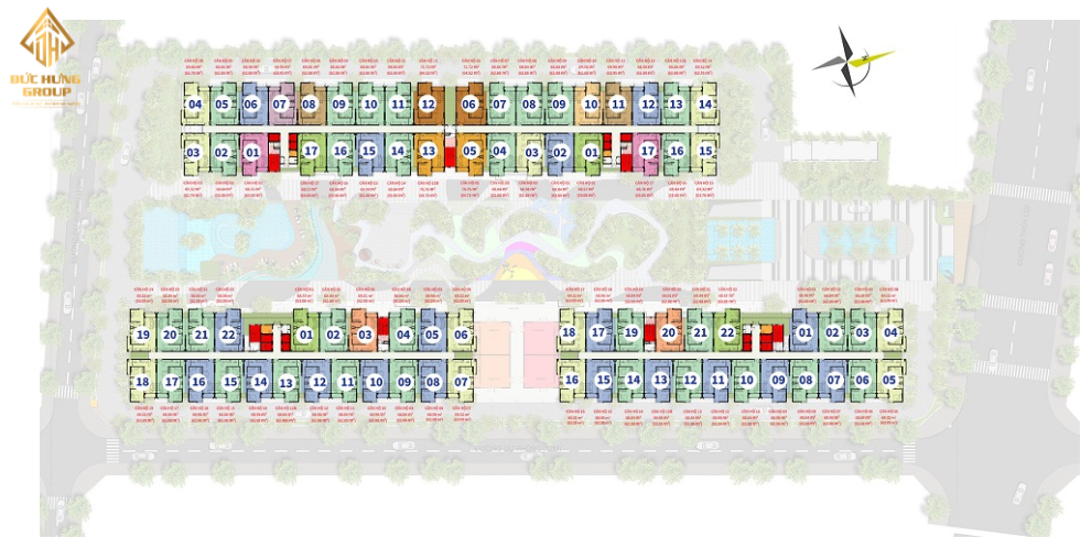 Mặt bằng chi tiết căn hộ Him Lam Phú An nằm trên tổng diện tích 18.170,7 m2 với diện tích xây dựng 35%, gồm 4 Block cao 17 tầng ( Tầng hầm và tầng trệt đậu xe hơi, Tầng 2 đậu xe gắn máy, Tầng 3-16 là khu căn hộ) với tổng số căn hộ là 1.092 căn hộ.