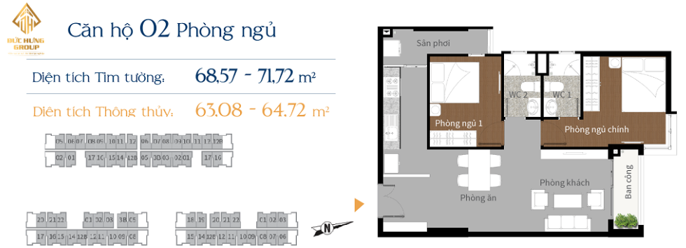 – Căn hộ 2PN – 2WC, có diện tích thông thủy: 63.08m2 – 64.72m2, diện tích tim tường: 68.57m2 – 71.72m2